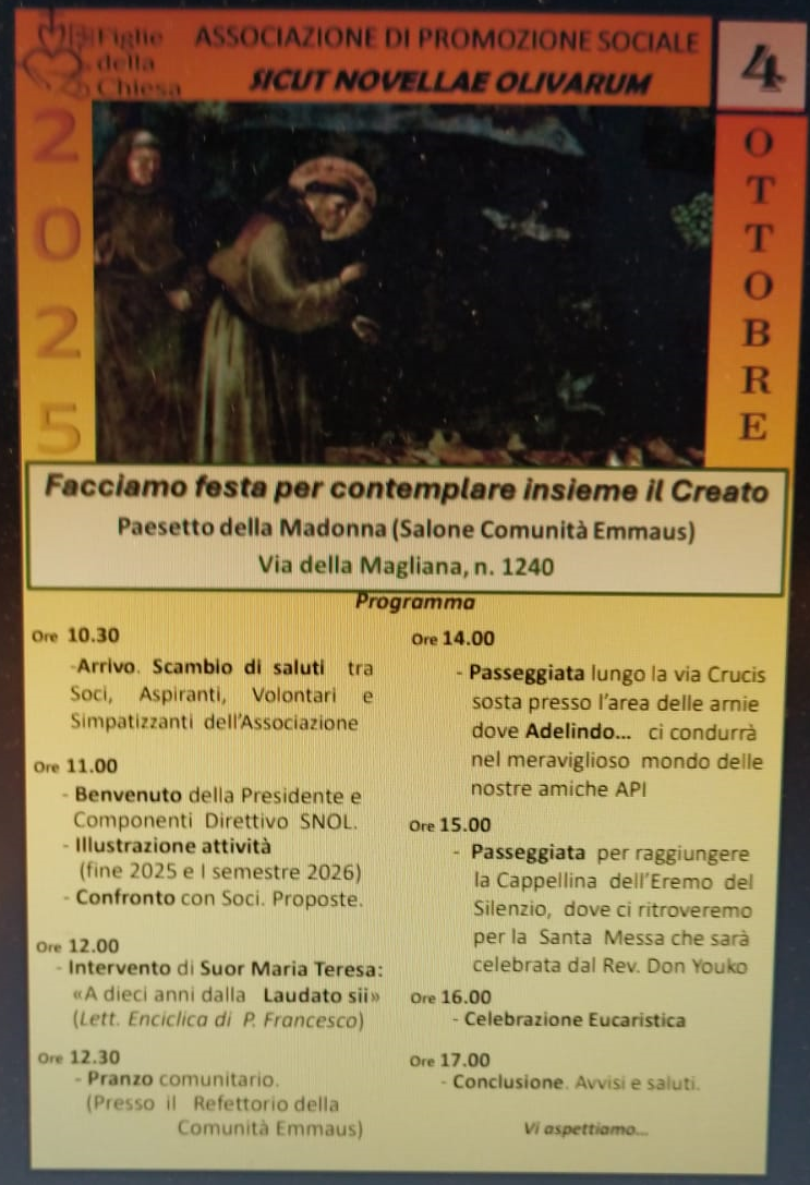 Si è svolta una giornata dedicata ai soci , per conoscersi meglio, per confrontarsi, pregare insieme, stare a contatto con la natura e favorire una maggiore partecipazione di chi, tra tutti, risultasse interessato a partecipare più attivamente alle iniziative dell'associazione.